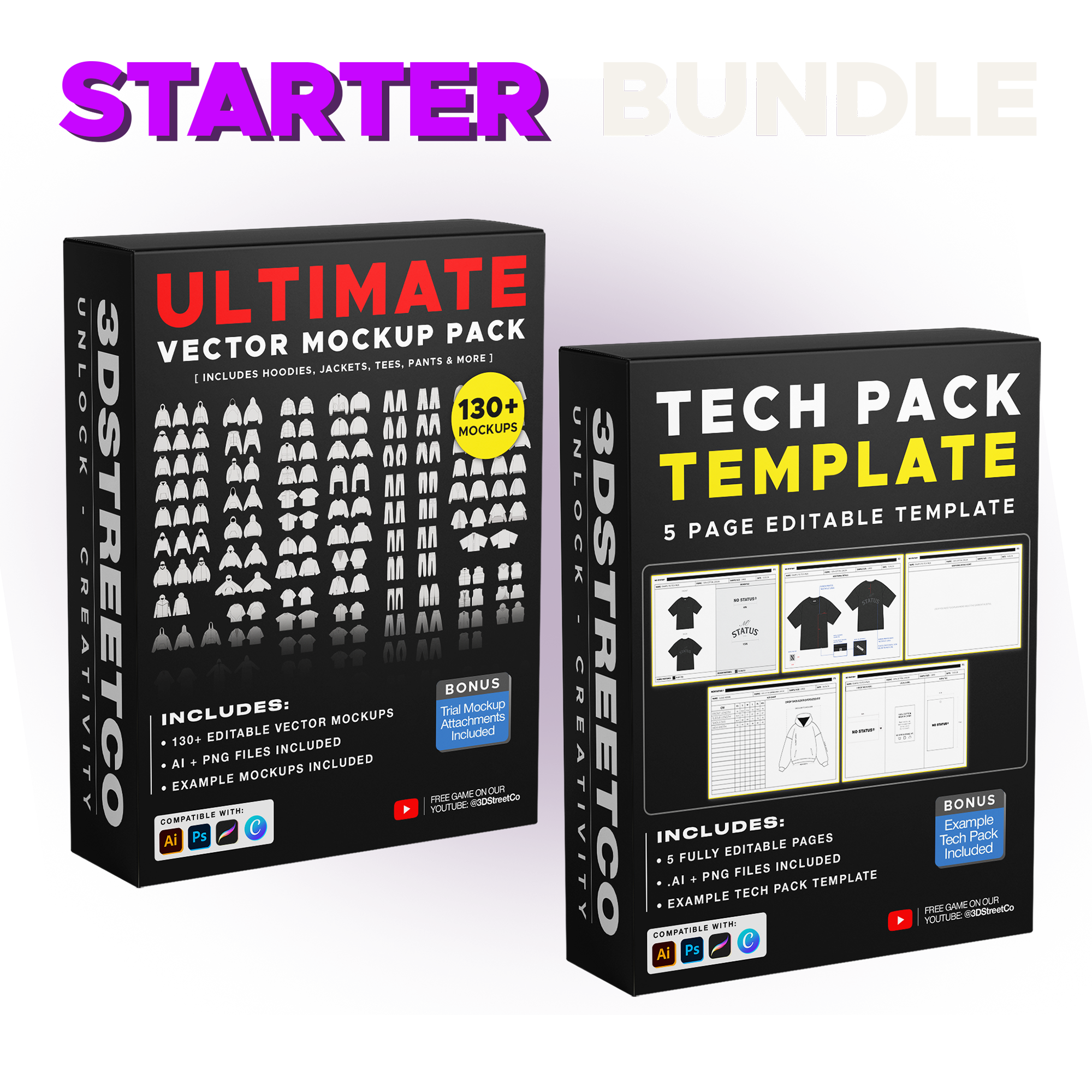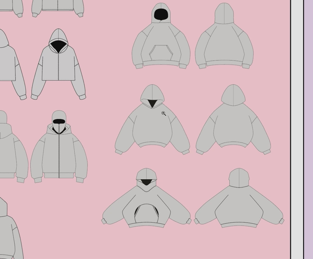 A clean, efficient bundle featuring hoodies, jackets, shirts, vests, beanies, socks, shorts, caps, tote bags, balaclavas - plus a fully editable 5-page tech pack to fast-track your clothing brand workflow.
